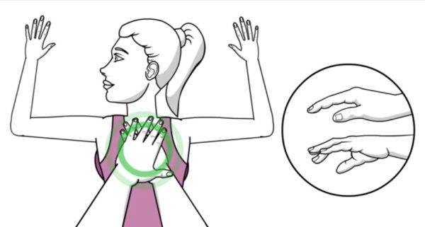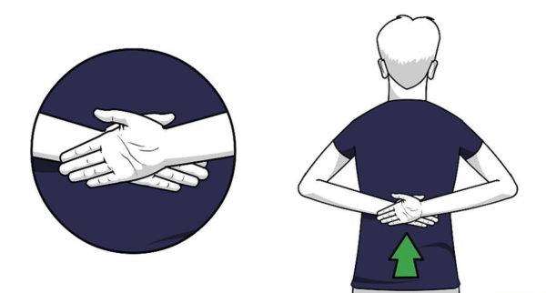 Шаг 1. Декомпрессия позвонков стоя. Требуется завести руки за спину, соединить их и положить на спину. После этого нужно наклониться назад и надавить на позвоночник одновременно. Позвоночник издаст характерный щелчок. Если чувствуется боль, то выполнять упражнение нельзя.