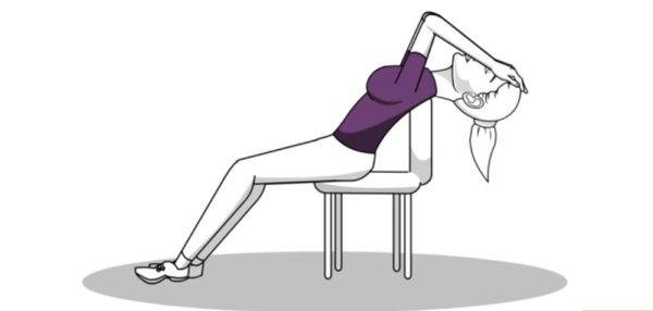Шаг 2. Декомпрессия на стуле. Требуется сдвинуться на край стула и откинуться на его спинку, а ладони рук поместить на лоб. Голову и плечи нужно попытаться опустить ниже по направлению за спинку стула.