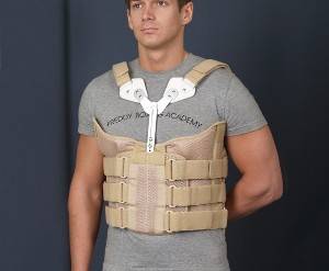 Чтобы зафиксировать грудной отдел, используют фиксационно-реклинирующий корсет, а для фиксации шейного отдела применяют жилет с головодержателем.